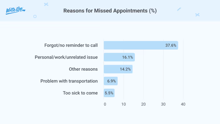 15.2% of practice appointments are typically missed, with a recent study finding that 37.6% of those no-shows missed their appointment because they forgot to show up or didn’t know how to reschedule or cancel: