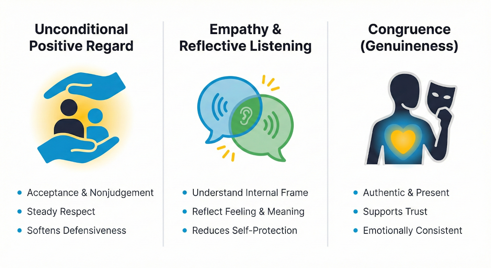 In practice, this shows up through a calm and nondirective attitude. The therapist stays present when the client shares difficult feelings or parts of themselves they feel ashamed of. The therapist does not punish openness with withdrawal or moral judgement. When acceptance is reliable, defensiveness can soften, and the client may find it easier to speak honestly, supporting greater self-acceptance and a more realistic sense of worth.